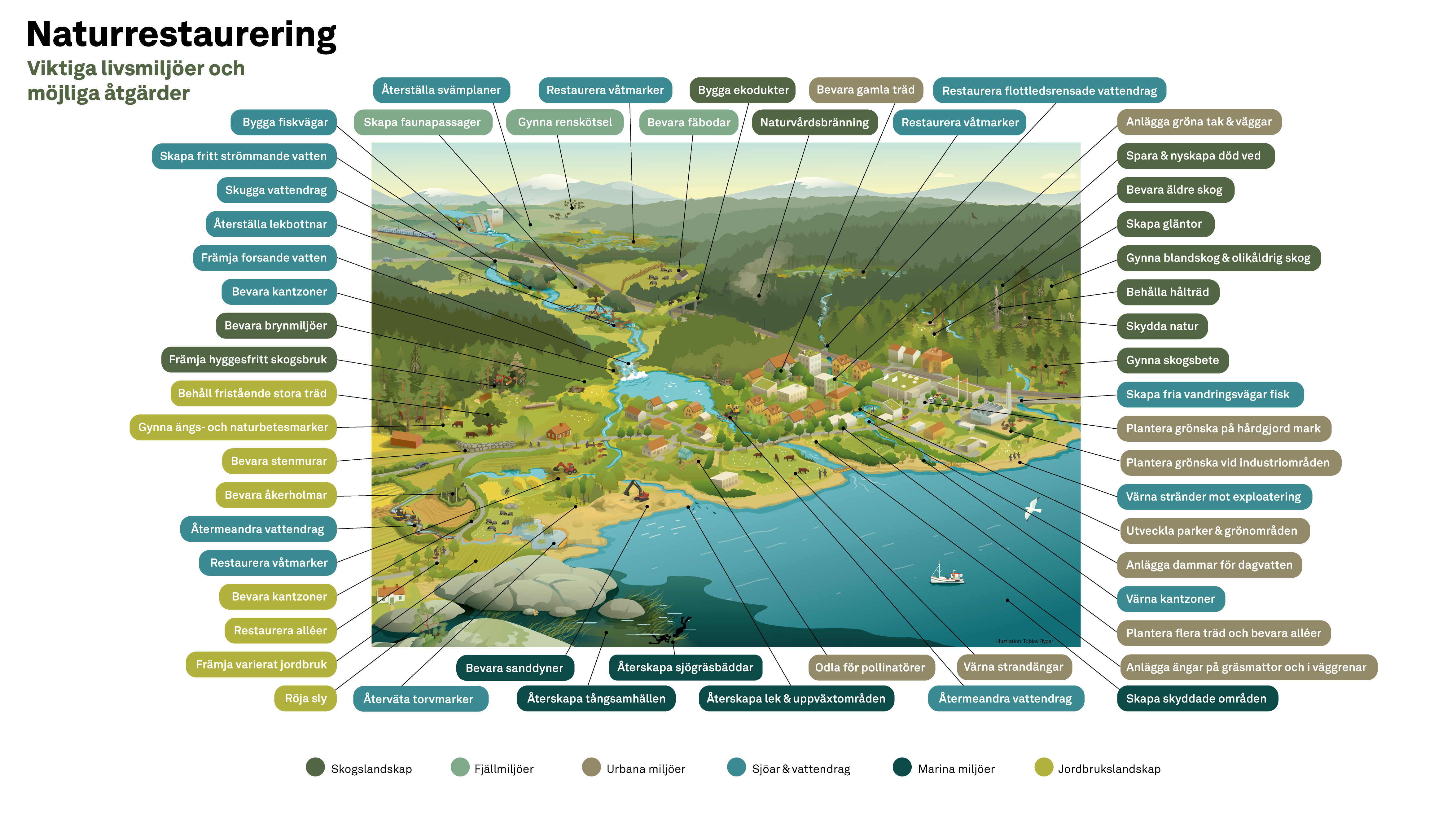 Det finns en mängd olika metoder och åtgärder för att restaurera natur. Illustrationen ovan visar pilar med exempel på åtgärder som har genomförts, genomförs och som kan komma att genomföras framöver.