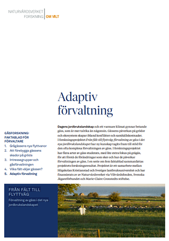 Dagens jordbrukslandskap och ett varmare klimat gynnar betande gäss, som är mer talrika än någonsin. Gässens påverkan på grödor och ekosystem skapar ibland konflikter och samhällskostnader. I forskningsprojektet Från fält till flyttväg: förvaltning av gäss i det nya jordbrukslandskapet har ny kunskap tagits fram till stöd för den ofta komplexa förvaltningen av gäss. I en serie om fem faktablad sammanfattas projektets forskningsresultat. FAKTABLAD 5: Adaptiv förvaltning